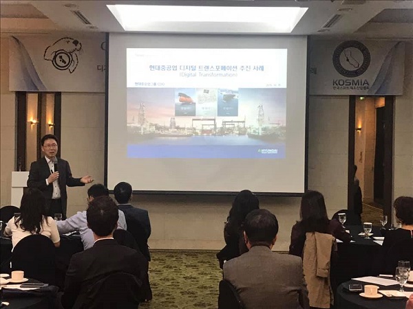 현대중공업 김태환 전무가 자사에서 추진되고 있는 디지털 트랜스포메이션 현황에 대해 설명하고 있다.