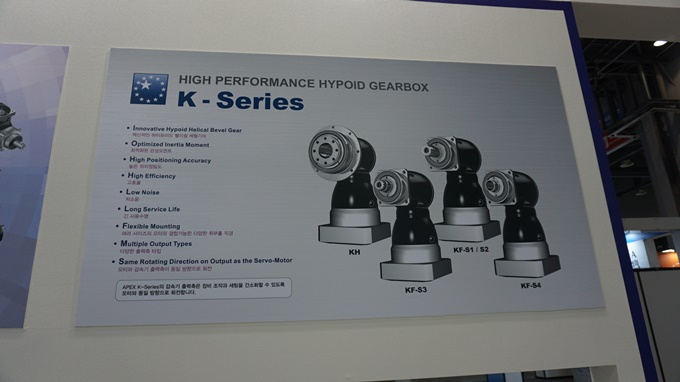 아펙스 다이나믹스 코리아(Apex Dynamics Korea)가 2019 한국기계산업전에서 기어박스(GearBox) AT 시리즈, ATB 시리즈, K시리즈 등과 정밀 감소기 AB/ABR 시리즈, AE/AER 시리즈 등 다양한 제품라인업을 선보였다.