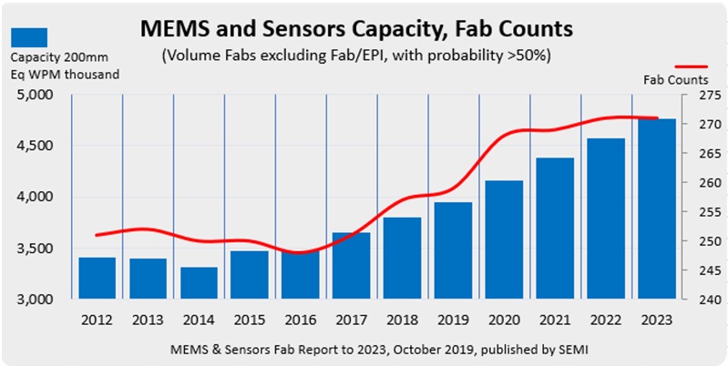 글로벌 전자공급망을 대표하는 산업협회인 SEMI는 MEMS&센서 팹 보고서를 통해 MEMS(Micro-Electro Mechanical Systems, 미세전자기계시스템) 및 센서 팹의 월간 생산량이 2023년에는 약 470만장 웨이퍼(200mm기준)로 2018년 대비 약 25% 증가할 것이라고 30일 발표했다.