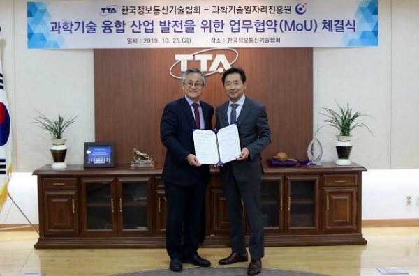 ▲ 한국정보통신기술협회 박재문 회장(왼쪽)과 과학기술일자리진흥원 배정회 원장.