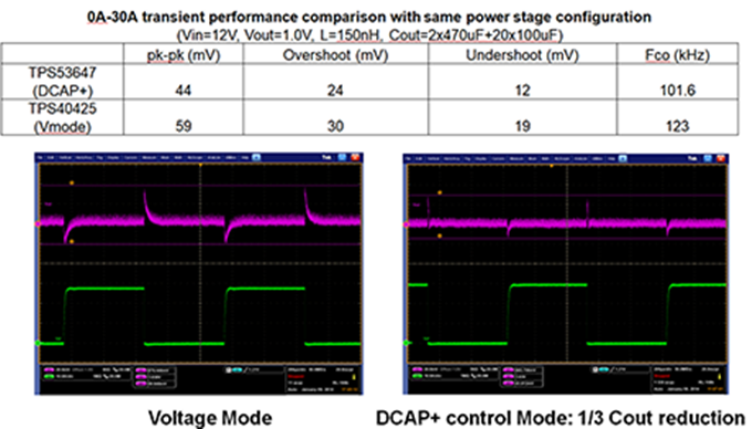 그림 1은 이러한 부하 트랜션트 조건에서 TI의 전압 모드 컨트롤러와 D - C A P + 컨트롤러를 비교하고 있다.