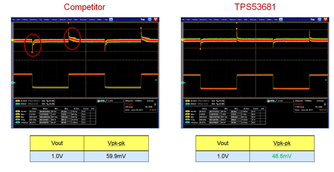 이러한 결과는 동일한 마더보드로 정확하게 동일한 조건 으로 얻어진 것이다. TPS53681 D-CAP+ 컨트롤러는 더우수한 부하 트랜션트 응답과 더 빠른 출력 전압 안정화를 달성할 수 있다.