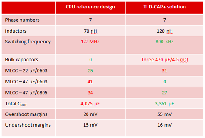표 1은 이 결과를 요약해서 보여준다. D-CAP+ 제어 솔루션은 CPU 오버 슈트 및 언더슈트 요건을 충족하면서 42개의 MLCC와 700°F 이상의 출력 커패시턴스를 줄일 수 있다. 어떤 D-CAP+ 제어 모드 전압 레귤레이터와 경쟁 레귤레이터를 비교해도 결과는 표 1과 비슷하다.