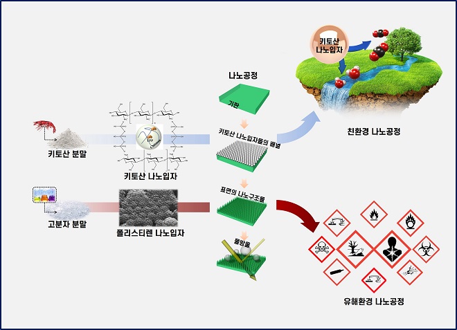 ▲게 껍데기를 이용한 친환경 나노공정과 일반적인 고분자 나노입자를 사용하는 공정의 비교 <사진 : 한국기계연구원>