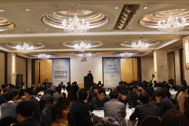▲2019 산업입지 컨퍼런스 전경. 황규연 이사장이 개회사를 발표하고 있다.