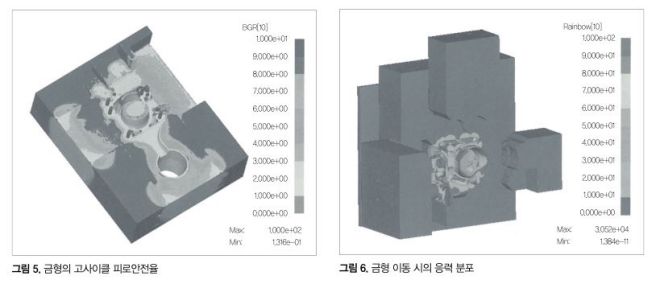 MAGMASOFT로 주조 공정에서의 금형 온도 분포를 구하고, ADVENTURECluster의 해석 모델에 맵핑한다. 여기서 발생하는 열응력 이력을 해석에 의해 구하고, 그 결과로부터 피로안전율을 평가할 수 있다(그림 5).