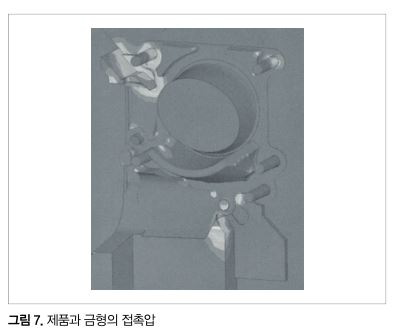 금형 내에서 응고한 제품의 압출 공정을 해석 상에서 모의함으로써 이형 시에 발생하는 트러블을 사전에 대책하는 것이 가능하다(그림 6). 제품의 열수축 과정에서는 복잡하게 변화하는 부품끼리의 접촉 상태를 고려해 서로 붙은 부위의 강약을 평가할 수 있다(그림 7).