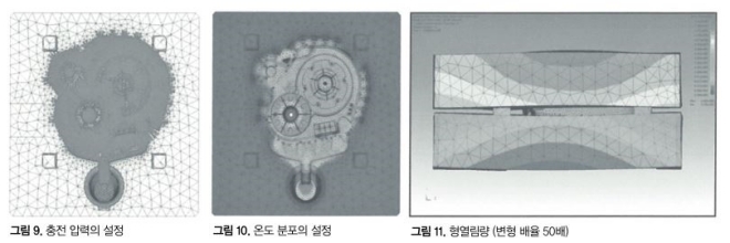 주조 프로세스 시뮬레이션에 더해 코어의 모래 충전․경화 시뮬레이션 기능도 탑재되어 코어의 제조 프로세스에도 대응하고 있으며, 탕흐름에 동반하는 결함이나 응고 시의 싱크홀 예측, 주물의 잔류응력․변형․균열 예측이 가능하고 주형이나 코어형의 설계와 주조 방안의 최적화가 가능하다(그림 1).