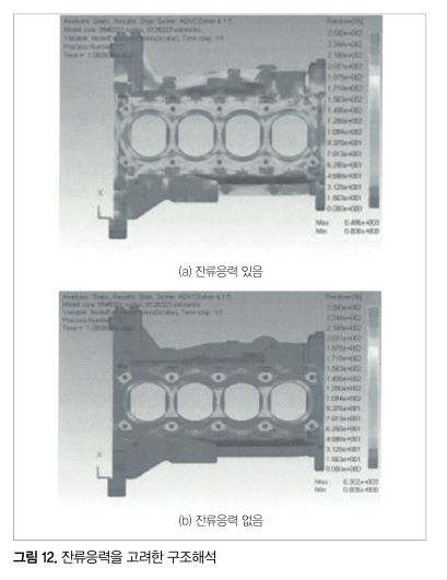 MAGMASOFT로 주조 프로세스에서 발생하는 잔류응력을 구하고, ADVENTURECluster의 해석 모델에 맵핑, 잔류응력을 가진 상태에서 구조해석을 실시함으로써 제품 강도나 피로내구성 평가의 예측 정도 향상으로 이어지고 있다(그림 12).