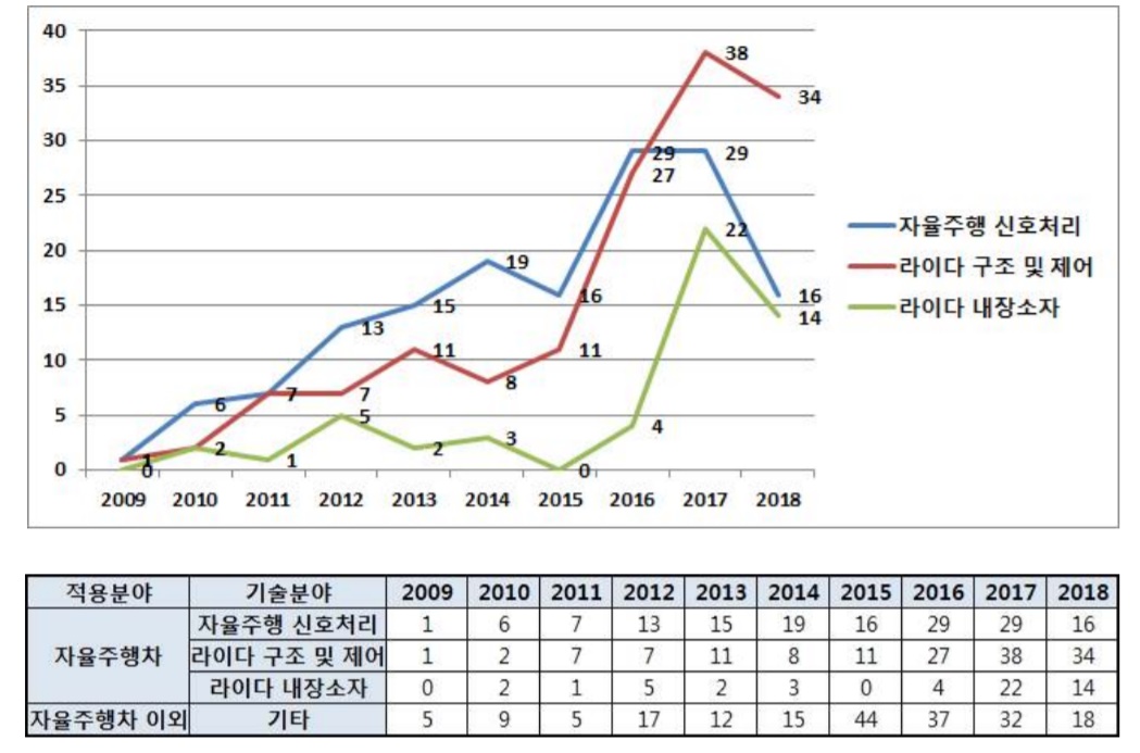 구조 및 제어 분야에서는 회전형 라이다 기술이 대다수 출원되고 있으며, 라이다 내장소자 분야에서는 수광소자가 주를 이루나,