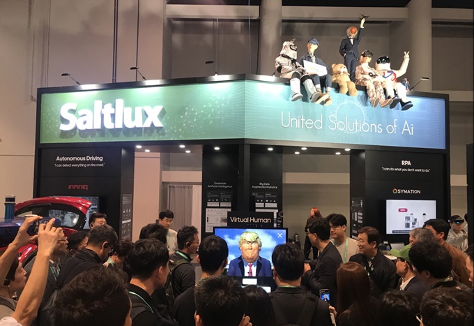 솔트룩스는 "행사 동안 자사의 부스에는 삼성, 현대자동차, LG, 두산, CJ, SM Ent., 한솔교육, 신한은행, 동부생명, 경남은행, 제주자치도, IBM, 아마존, 엡손, 파나소닉, 싱가포르 정부 등 국내외 대기업 및 공공기관 관계자 등을 비롯해 약 3천 명 이상의 관람객이 방문했다. 특히 이 중에서도 가장 큰 주목을 받은 기술은 ‘도널드 트럼프’ 미국 대통령을 캐릭터화한 ‘인공지능 가상인간(AI Virtual Human)’ 이다. ‘트럼프’ AI는 유튜브∙트위터 데이터를 기반으로 실제와 동일한 언어와 음성, 시각 지능을 제공하며, 실제 사람과 대화하듯 질문과 답변을 자유롭게 주고받을 수 있다."고 소개했다.