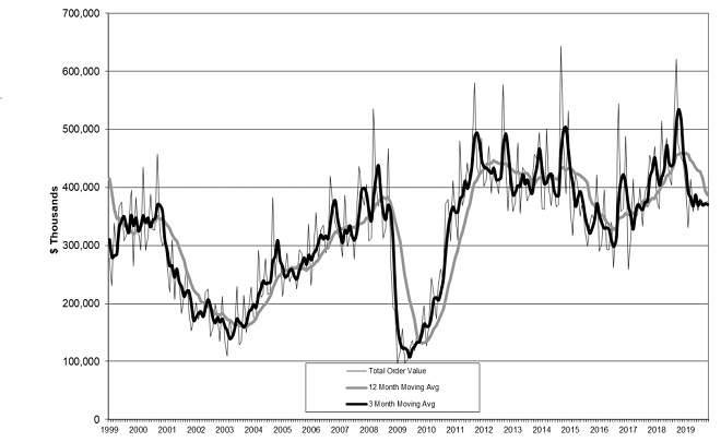 ▼ 2019년 10월 미국 공작기계 수주 현황 (Total U.S. Manufacturing Technology Orders Through October 2019)