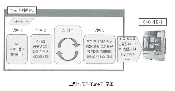 EF-Tune은 이러한 개념을 베이스로 해서 입력 정보(NC 프로그램, 잔삭값, 공구 손잡이 길이, 가공 사이즈)로부터 AI 모델을 탑재한 해석 엔진을 경유해, 최적의 절삭 이송 속도와 고속․고정도 윤곽 제어의 파라미터를 산출하고 있다.