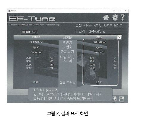 EF-Tune의 개략 구조를 그림 1에 나타냈다. EF-Tune은 별도 설치한 퍼스널컴퓨터 상에서 동작하는 애플리케이션으로, CAM에서 출력된 NC 프로그램을 EF-Tune에 읽어 들여 잔삭값, 공구 손잡이 길이, 가공 사이즈의 정보를 입력, 실행시킴으로써 최적의 절삭 이송 속도, 고속․고정도 윤곽 제어의 파라미터를 제시한다(그림 2).
