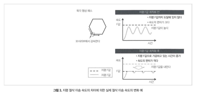 지령 절삭 이송 속도의 차이에 의한 실제 절삭 이송 속도의 변화를 그림 3의 사례에 나타냈다. 동 그림은 육각 형상의 가공 패스를 일정한 지령 절삭 이송 속도로 가공하는 경우를 나타낸 것인데, 실제 가공에서는 각부에서 감속하기 때문에 실제 절삭 이송 속도는 감속을 반복하는 움직임이 된다.