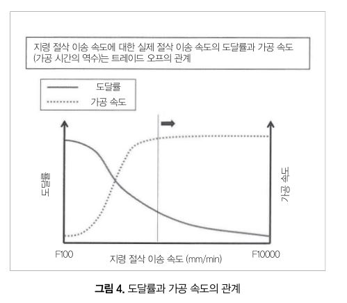 이 그림에서 나타냈듯이 도달률과 가공 속도에는 트레이드 오프의 관계가 있으며, 목적에 따라 최적의 지령 절삭 이송 속도는 변화한다. 예를 들면 거친가공이면 가공 속도를 우선하는 방향으로 설정하고, 다듬질가공이면 도달률을 우선하는 방향으로 지령 절삭 이송 속도를 설정하는 등의 고려가 필요하다.