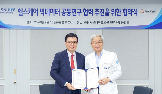 로보틱 프로세스 자동화(Robotic Process Automation, 이하 RPA) 기업 오토메이션애니웨어(Automation Anywhere)가 13일 분당서울대학교병원과 헬스케어 빅데이터 공동연구를 위한 상호협력 양해각서(MOU)를 체결했다고 밝혔다.