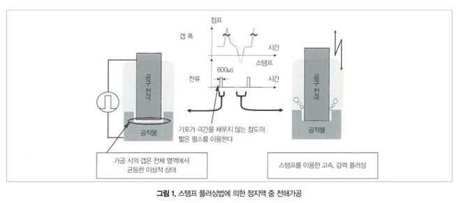 그림 1에 나타냈듯이 정지액 중에서 갭을 기포가 채우지 않는 정도의 충분히 짧은 펄스의 인가, 스탬프나 점프에 의한 플러싱을 반복함으로써 분류를 이용하지 않고 가공하는 것이 가능하다.
