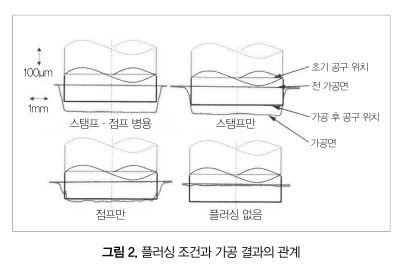 또한 스탬프만을 이용한 경우는 정도는 약간 저하하지만 가공 자체는 진행하고 있으며, 형조가을 진행시킬 수 있는 정도의 플러싱성을 발휘할 수 있다.