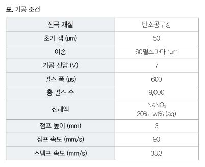 표에 나타낸 가공 조건은 가공이 안정되게 진행한 경우, 갭 길이가 항상 50μm 정도가 되도록 실험적으로 조정한 것이다. 스탬프에서는 모터에 갭을 100μm 줄이게 하는 지령값을 부여한다. 실제로는 스탬프 중에 전극이 접촉해 갭이 제로가 된 후, 기계계가 탄성적으로 휘어지고 있는 것으로 생각된다. 또한 스탬프 속도는 스탬프 동작의 최고 속도인 것으로 한다.