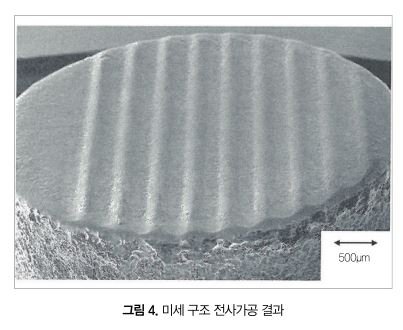 2차원적인 장방형 슬롯 형상의 2군데 코너에 대해, 교대로 펄스 인가와 스탬프에 의한 플러싱을 반복함으로써 양호한 진직도를 갖는 코너 가공을 달성했다. 가공 결과를 그림 3에 나타냈다. 또한 전극 끝단면 전체에 미세 구조를 가진 공구 전극을 이용하는 전사가공도 가능하다. 가공 결과를 그림 4에 나타냈다.