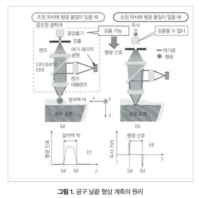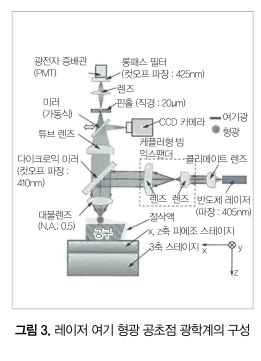 이번 연구에서 제안하는 레이저 여기 형광 공초점법의 원리를 그림 1에 나타냈다.