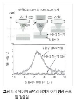 경면 연마된 실리콘 웨이퍼 표면에 CFS-100PA를 스핀 코트를 이용해 균일하게 도포한 시료를 이용, 피에조 스테이지에 의해 z방향으로 50μm 주사했을 때의 레이저 여기 형광 검출특성을 조사했다.