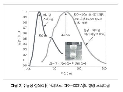 그래서 형광 분광광도계 [FluoroMax-4; ㈜堀場(호리바)제작소]를 이용해 실제 가공에 이용되고 있는 수용성 절삭액인 CFS-100PA[(주)네오스]의 형광 분광특성을 분석했다. 수용성 절삭액은 물로 10~20배로 희석해 사용되며, 그림 2 중의 사진에 나타냈듯이 희석하면 유화돼 유백색이 되는 에멀젼 타입이다.