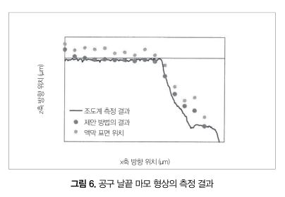 양자의 측정 결과는 양호하게 일치하고 있으며, 절삭액 막의 두께(수 μm) 차이의 영향을 받지 않고 마모를 포함하는 날끝 형상의 특징을 명확하게 파악하고 있다. 이상으로부터 수 μm 정도의 수용성 절삭액 막 표면, 공구 날끝 표면 위치 및 절삭액 막의 두께가 서브 μm 오더의 정도로 측정 가능하다는 것이 검증됐다.