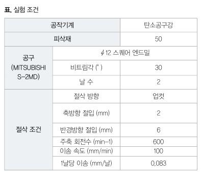 표의 실험 조건으로 엔드밀 가공을 해, 제안 시스템의 유용성을 검증했다. 전단각과 공구의 편심량은 절삭 개시에서 1.0s의 사이에 모니터링된 주축 모터의 토크에서 동정했다.