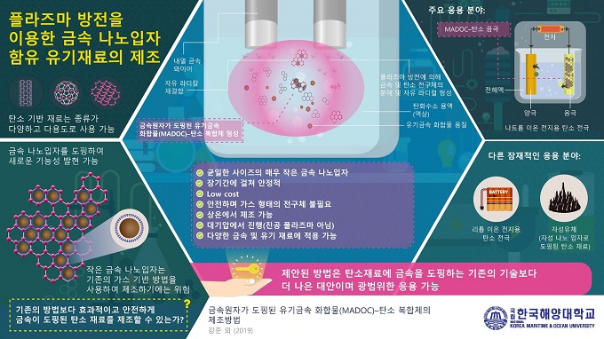 강준 교수는 “플라즈마 방전을 통해 금속원자를 탄소지지체에 도핑하면, 금속 원자가 장시간 안정적으로 열화되지 않고 높은 성능을 발휘할 수 있으며 위험한 가스 형태의 물질을 사용하는 기존의 방법보다 안전하고, 매우 작은 금속을 계속적으로 얻을 수 있다는 장점이 있다”며 “이 제조법을 통해 유기용매에 포함된 탄소가 폴리머화(polymerization)를 일으키면 초 미세 금속원자가 삽입된 복합체를 제작할 수 있다”고 말했다.