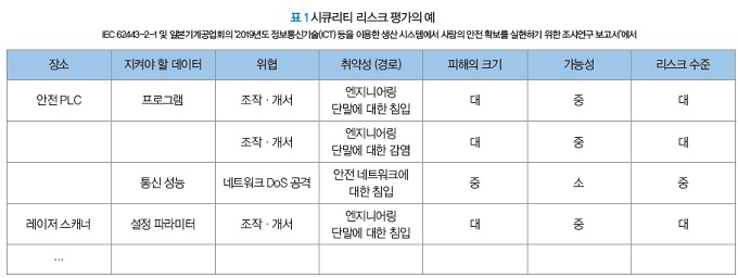 각각 3레벨 정도의 손해와 발생 확률의 매트릭스에서 4레벨의 시큐리티 리스크가 유도된다. 여기서 손해의 크기는 사고 시나리오에서 추정할 수 있지만, 발생 확률은 데이터에 대한 액세스 빈도, 공격 난이도, 범인의 동기 등 많은 파라미터가 영향을 미친다. 그러나 시큐리티 전문가는 모르겠지만 기계 설계자가 이러한 파라미터를 고려하는 것은 어렵다. 그러나 3레벨의 발생 확률이면, 파라미터의 의논에 시간을 소비할 것까지도 없고 직감적으로 추정할 수 있다. 그래서 기계 분야에서는 고려할 항목을 줄인 리스크 평가 방법을 제안하고 있다. 시큐리티 리스크 평가의 예를 표 1에 나타냈다.