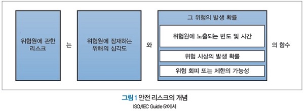 시큐리티도 리스크를 다루므로 먼저 안전 리스크의 개념을 설명한다. ISO/IEC Guide51에 따르면, 안전 설계는 리스크 평가와 허용 가능 리스크의 개념에 기초한다. 리스크는 기계의 위험원(해저드)에서 발생하는 위험의 심각성(손해)과 그 발생 확률로부터 도출된다. 예를 들면 어떤 장치에 대해 사망 사고가 자주 발생하는 위험원이 있으면, 그 위험원은 고 리스크로 간주된다. 즉, 위험원마다 리스크는 다르다. 리스크의 개념을 그림 1에 나타냈다.