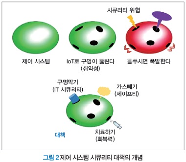 제어 시스템을 IoT 등 네트워크 접속하면, 취약성의 구멍이 많이 생긴다. 이 구멍을 위협이 들쑤시면, 폭발하거나 물고 늘어지거나 하는 손해(사고)가 발생한다. 생각되는 대책은 3종류가 있으며, 첫 번째는 취약성의 구멍을 막는 즉, IT 시큐리티 대책이다. 두 번째는 미리 위험원을 제거해 손해 규모를 줄이는 안전 대책이다. 세 번째는 혼란스러운 상황을 신속하게 진정시키거나 혹은 치료하는 신속한 복구(회복력)이다. 이하, 각각의 대책에 대해 설명한다.