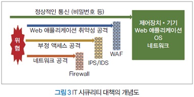 방화벽, 침입 검지, 액세스 제어․인증, 화이트리스트 등의 사이버 시큐리티 대책은 어떤 위협이 취약성을 빠져 나올 확률을 감소시키는 데 효과적이다. 방지 목적에 따라 다른 대책을 조합한다. 예를 들면 네트워크 공격은 방화벽, 부정 액세스 공격은 IPS/IDS(Intrusion Prevention System, Intrusion Detection System), Web 애플리케이션 공격은 WAF(Web Application Firewall)에 의해 방지할 수 있다. 또한, 기기마다 비밀번호 등의 액세스 제어를 실시함으로써 침입 및 부정 액세스의 확률을 줄일 수 있다. IT 시큐리티 대책의 개념을 그림 3에 나타냈다.