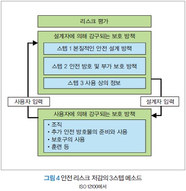 안전 대책은 그림 4에 나타낸 ISO 12100의 3스텝 메소드에 기초해 실시된다. 우선 위험원 자체를 없애거나 또는 경감하는 본질적인 안전 대책, 다음으로 안전 펜스나 비상 정지 등의 안전 방호와 부가 보호 방책, 마지막으로 표시나 매뉴얼 등 사용상의 정보 제공 방책을 강구한다. 그리고 기계의 사용자는 필요에 따라 보호 방책을 추가한다. 이러한 안전 대책에 의해 잔류 리스크를 허용 수준 이하로 한다.