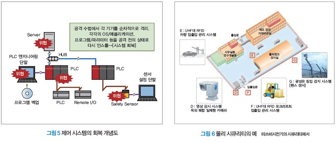 신속한 복구를 위해 먼저 위협을 특정하고, 위협을 제거해야 한다. DoS 공격 등은 회선 절단으로 대응할 수 있지만, 악성 코드 등의 감염은 그 침입․감염 경로를 조사해 적절한 순서로 악성 코드 제거를 진행하지 않으면 완전히 제거할 수 없다. 과거의 공격 예에서는 제어 시스템의 애플리케이션 소프트웨어(제어 소프트웨어) 혹은 파라미터(경보 관련 등)가 변경되어 있는 것이 대부분이다. 따라서 먼저 그들을 정상적인 상태로 회복하지 않으면 복구할 수 없다. 제어 시스템을 설정하는 엔지니어링 소프트웨어가 변경되어 있는 경우, 다시 인스톨할 필요도 있다. 제어 시스템의 회복 개념도를 그림 5에 나타냈다.