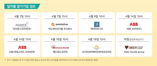 대한무역투자진흥공사(이하 KOTRA)가 코로나19로 움츠러든 외국인투자기업 채용시장을 살리기 위해 온라인 채용설명회를 연다. 4월 7일부터 시작돼 4월 16일까지 개최되는 이번 채용설명회에는 ABB코리아 등 외투기업 8개사와 국내 구직자 1000명 이상이 참가할 예정이다.