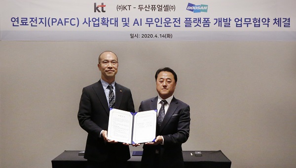 KT가 두산퓨얼셀과 연료전지 사업확대를 위한 양해각서(MOU)를 4월 14일 체결했다. 연료전지는 수소와 산소의 전기화학적 반응을 통해 전기와 열을 생산하는 고효율 발전 시스템이다.