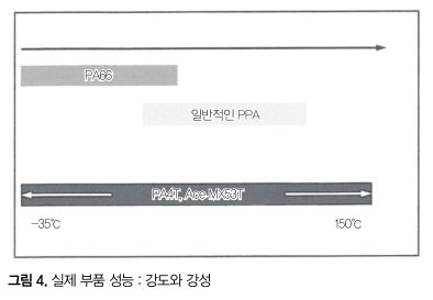③ 보다 높은 유리 전이 온도(PA66의 70℃에 비해 동 제품은 150℃).