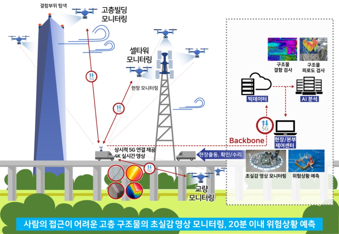 국토지리정보원의 보유 데이터(위성·항공·공간)와 연계를 통해 데이터를 확보하고, 센서 데이터 모델링과 표준화를 추진하는 한편, 음영지역 극복을 위한 스몰셀 기술 적용, 항공안전기술원(5G 드론 비행시험장) 및 통신사 네트워크를 연계한 드론 운용 실증, 5G 드론운용을 위한 임무 관제 플랫폼 구축도 병행하게 된다.