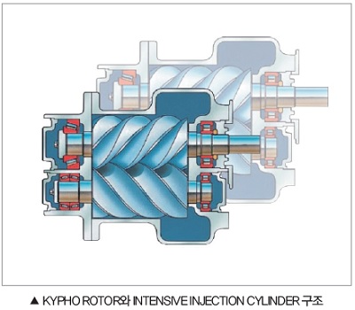 KYPHO ROTOR와 INTENSIVE INJECTION CYLINDER 구조는 압축 사이클의 쿨링에 에너지 소비율을 제어하는 핵심 요소이다.