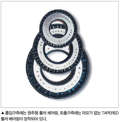 긴 수명을 가진 베어링은 오랜 서비스를 제공한다. 스크류 콤프레샤 흡입구에는 크고 원추형 롤러 베어링, 토출구에는 마모가 없는 TAPERED ROLLER 베어링이 장착되어 있다. 이 베어링들은 110,000시간 혹은 정상 작동에서 15~20년 이상 사용가능한 L-10 LIFE EXPECTANCY의 베어링이다.
