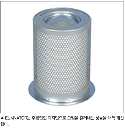 유창 기계공업의 ELIMINATOR는 주름잡힌 디자인으로 오일을 걸러내는 성능을 대폭 개선했으며, OIL CARRYOVER를 2PPM 이하로 최소화시켰다. 독특한 중막 붙임 특성을 가진 ELIMINATOR는 합성유에도 사용할 수 있다. 이러한 특징들로 인하여 공기 성능과 적응성을 최대화시켜 오일 손실을 최소화한다.