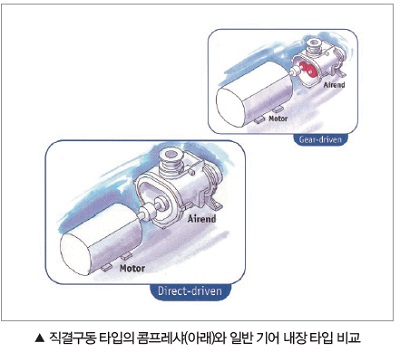 직결구동이란 말 자체만 놓고 보면 기어리스(Gearless)라고 생각하지 못할 것이다. 일반적으로 모터에 직접 연결되어 있는 것처럼 보이더라도 기어는 기어 박스 안에 내장되어 있다. 30HP~250HP까지의 모든(YES30-GLA/GLW~YES250-GLA/GLW) 콤프레샤는 효율성과 신뢰성을 최대화시킬 수 있는 기어리스(Gearless) 직결이다. 이처럼 완전한 직결구동 타입인 콤프레샤와 말로만 직결구동인 기어 내장 타입인 타사 제품과는 차원이 다르다.