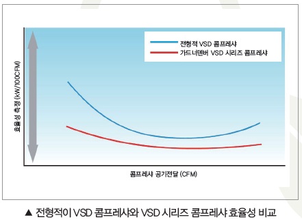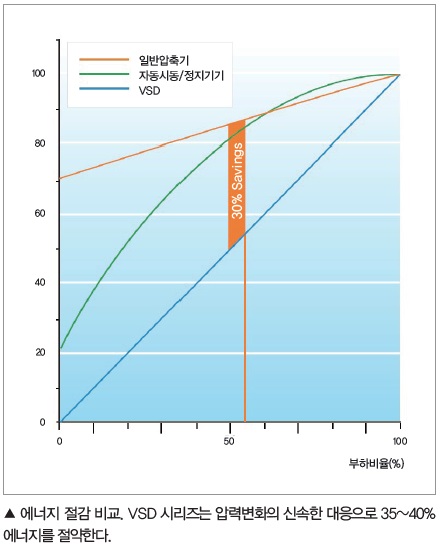 급유식 VSD(가변속도 구동) 인버터 스크류 VSD 시리즈 콤프레샤는 전부하, 부분부하, 무부하에서 효율성을 제공한다. 일반적인 타사의 VSD 콤프레샤는 성능을 극대화하도록 설계되어 있지 않다. 대부분은 단순히 현재의 제품에 가변속 구동과 모터를 사용했을 뿐이다.