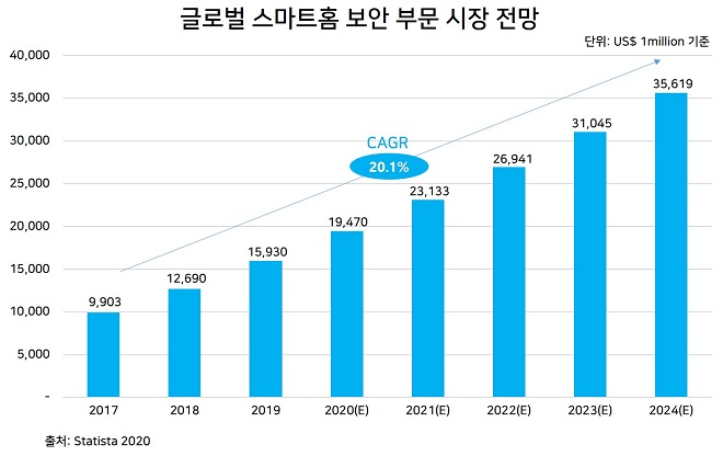 한편 시장조사 및 통계 전문기관 스타티스타(Statista)가 2019년 발간한 ‘글로벌 스마트홈 산업의 보안 부문 시장 전망 보고서’에 따르면 2019년 세계 스마트홈 보안 시장 규모는 약 99억 달러(한화 약 12조원)로 2024년까지 약 356억 달러(한화 약 43조원)로 성장할 전망이다. 2017년 이후 연평균 20%씩 증가하는 추세다.