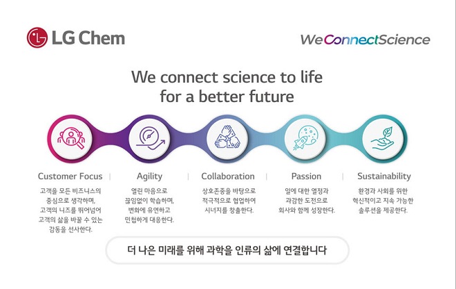 이날 행사에서 LG화학은 ‘We connect science to life for a better future(더 나은 미래를 위해 과학을 인류의 삶에 연결합니다)’라는 비전을 발표했다.