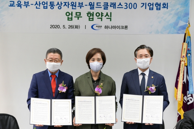 교육부와 산업통상자원부(이하 산업부), 월드클래스300 기업협회는 5월 26일(화) 하나마이크론에서 고졸취업 활성화를 위해 업무협약을 체결하고 상호 긴밀히 협력하기로 했다.