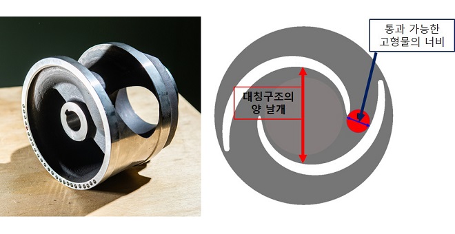 ▲(왼쪽)중심축이 치우치지 않는 설계를 통해 개발한 단일채널 펌프용 회전체, (오른쪽)최근 하수처리장에 설치되고 있는 회전체 양 날개 대칭구조의 회전체 참고 이미지